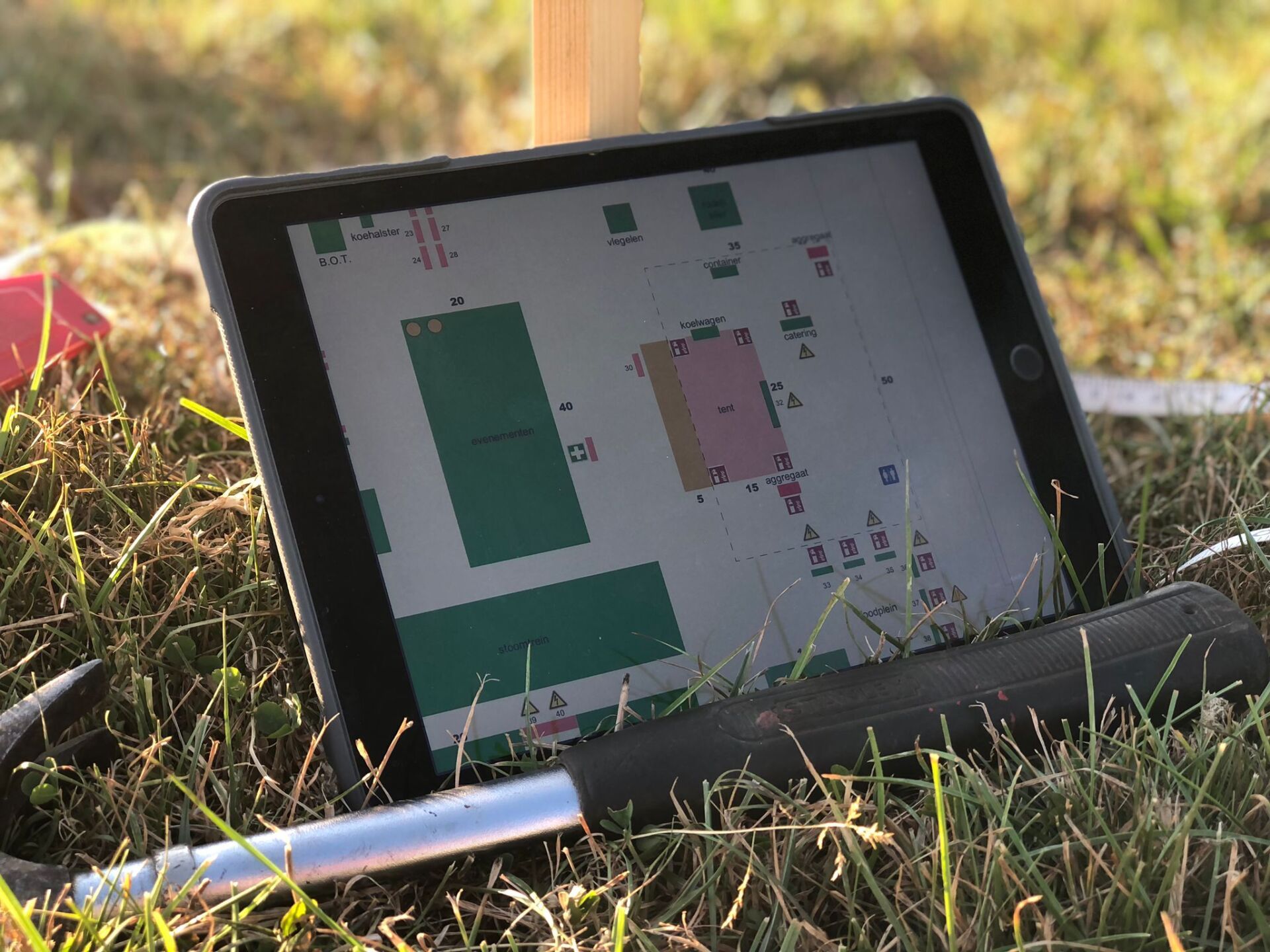 Naast het intekenen van de terreininrichting, hebben we de stichting ook ondersteund bij het uitzetten van het terrein. Hierbij hebben we de feesttent, grote weides en parkeergelegenheid digitaal uitgezet.